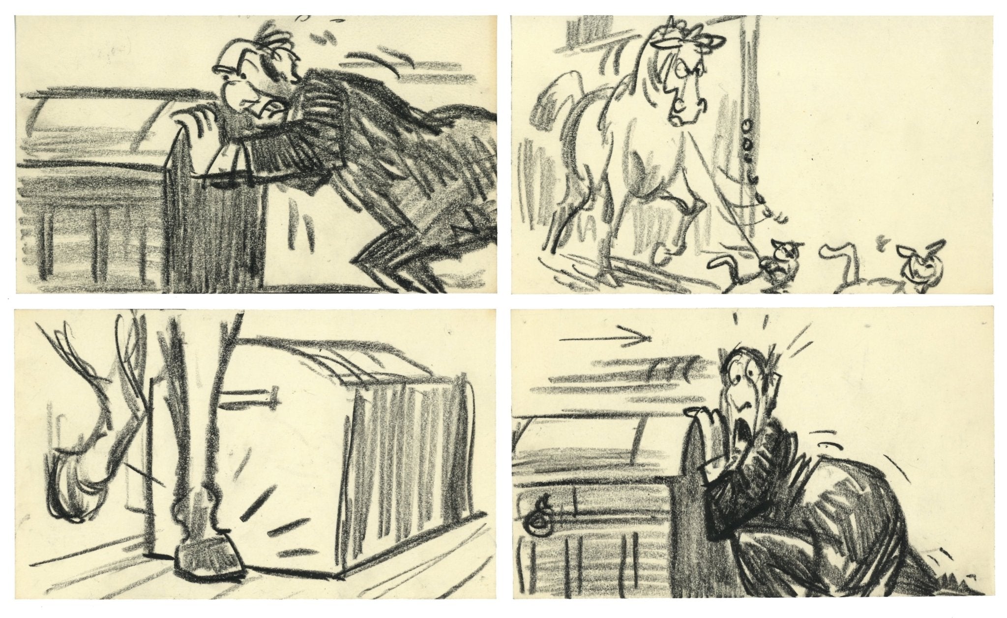 ABOUT THE IMAGE: These storyboards showcase the creativity involved in the making of The Aristocats. They were created for climactic sequence starting at about 1:12:52 when Edgar locks Duchess and her kittens in a trunk, ready to ship them off for good. O'Malley, Roquefort, Frau, and even Scat Cat and the Alley Cats help to stop him and make sure he's the one who is sent to Timbuktu. The artist of these storyboards is thought to be Vance Gerry (1929 - 2005), a storyboard, layout, and character artist at Disney for nearly 50 years.