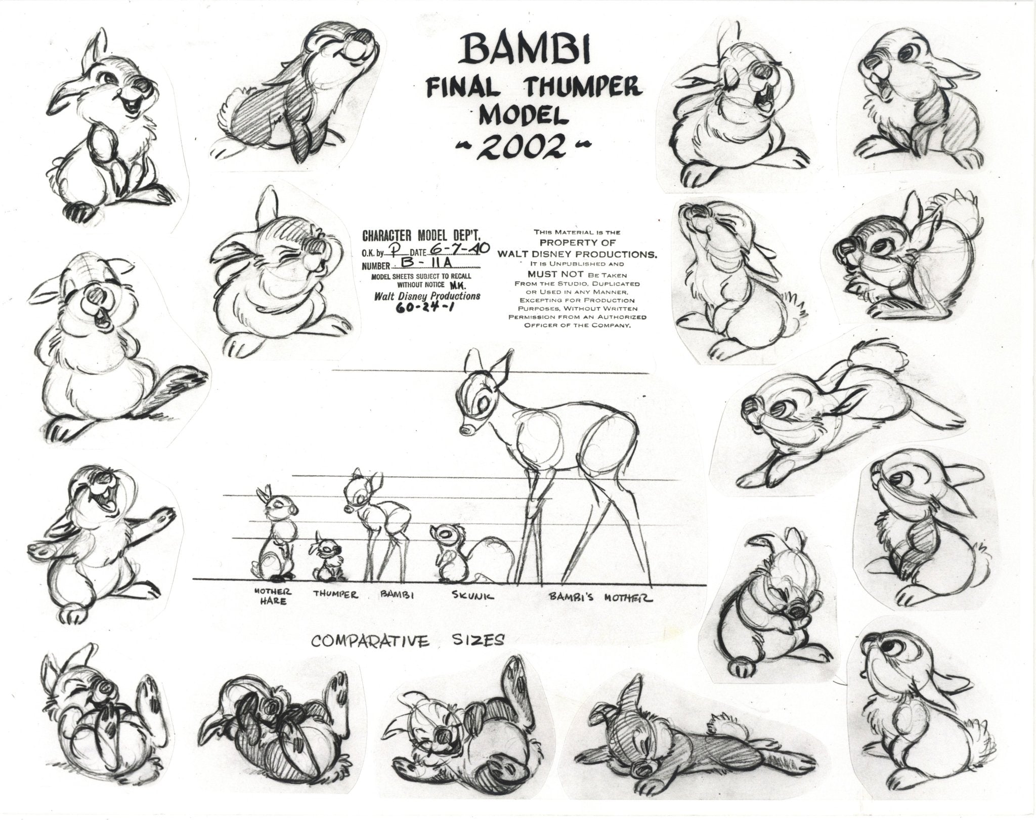 SPECIAL NOTES: This model sheet has been printed on thick Kodak photo paper and shows off the final model for the character Thumper. It also includes a character size comparison chart with Bambi and Flower for reference.