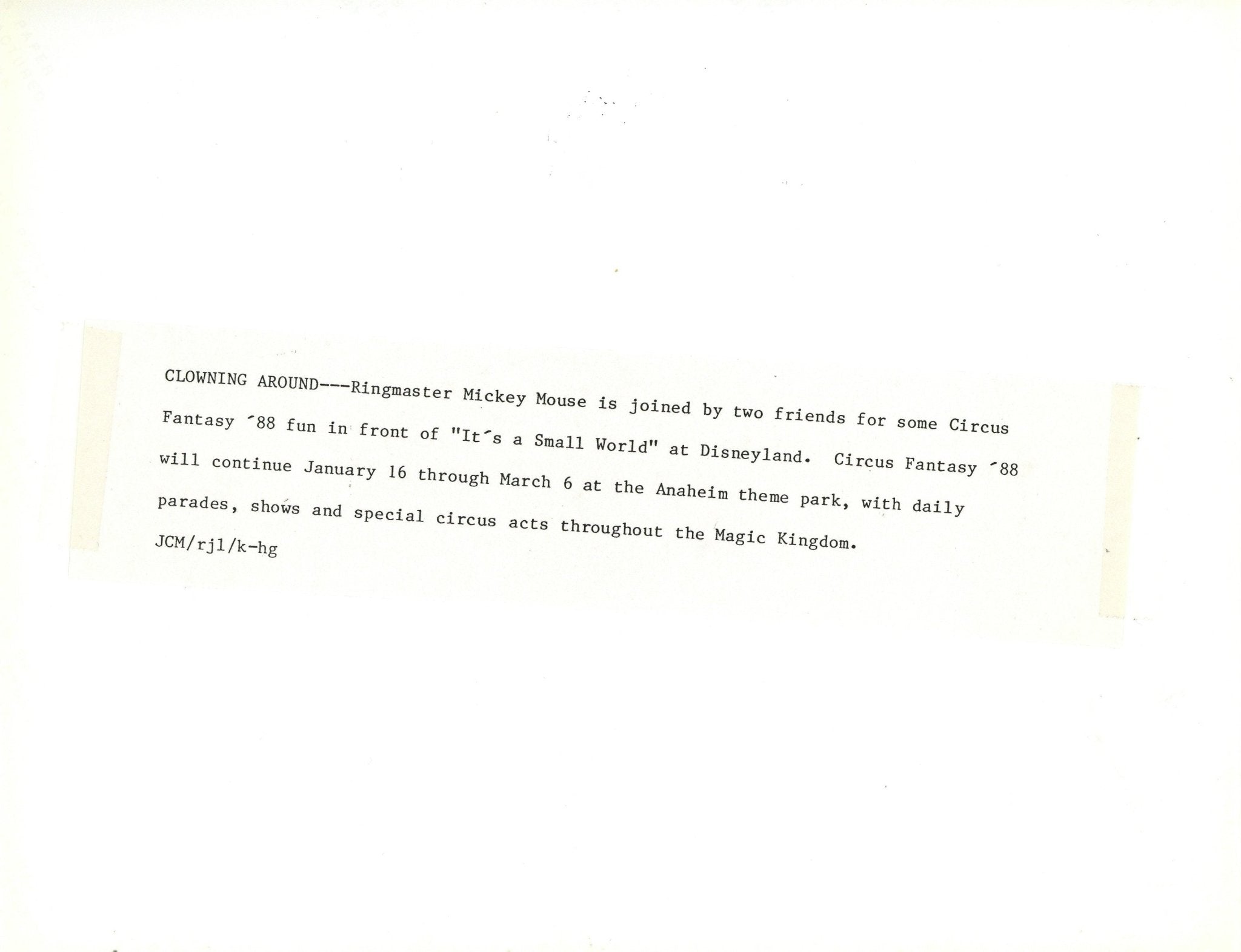 ABOUT THE IMAGE: "CLOWNING AROUND---Ringmaster Mickey Mouse is joined by two friends for some Circus Fantasy '88 fun in front of "It's a Small World" at Disneyland. Circus Fantasy '88 will continue January 16 through March 6 at the Anaheim theme park, with daily parades, shows and special circus acts throughout the Magic Kingdom."