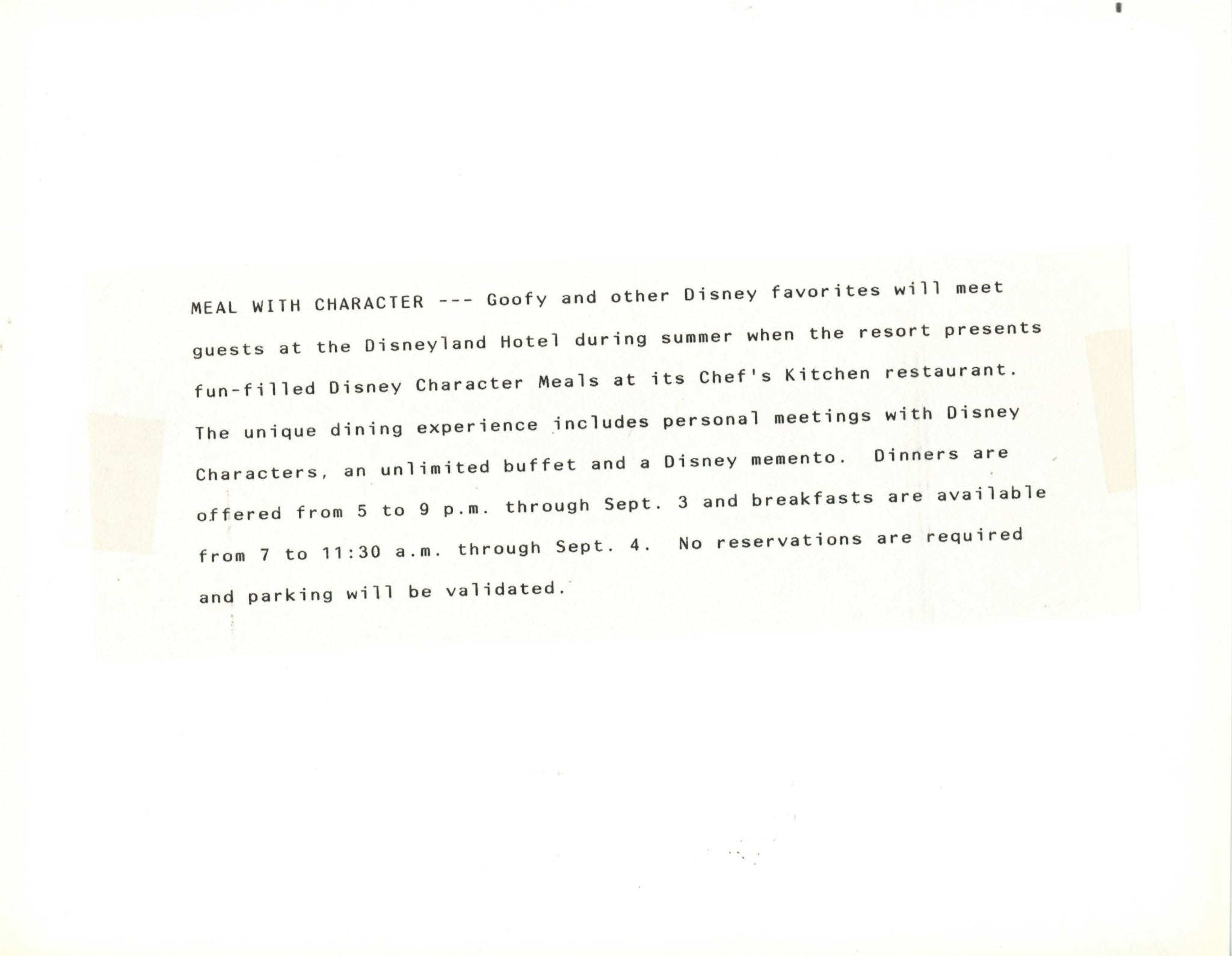 ABOUT THE IMAGE: "MEAL WITH CHARACTER --- Goofy and other Disney favorites will meet guests at the Disneyland Hotel during summer when the resort presents fun-filled Disney Character Meals at its Chef's Kitchen restaurant. The unique dining experience includes personal meetings with Disney Characters, an unlimited buffet and a Disney memento. Dinners are offered from 5 to 9 p.m. through Sept. 3 and breakfasts are available from 7 to 11:30 a.m. through Sept. 4. No reservations are required and parking will be validated."