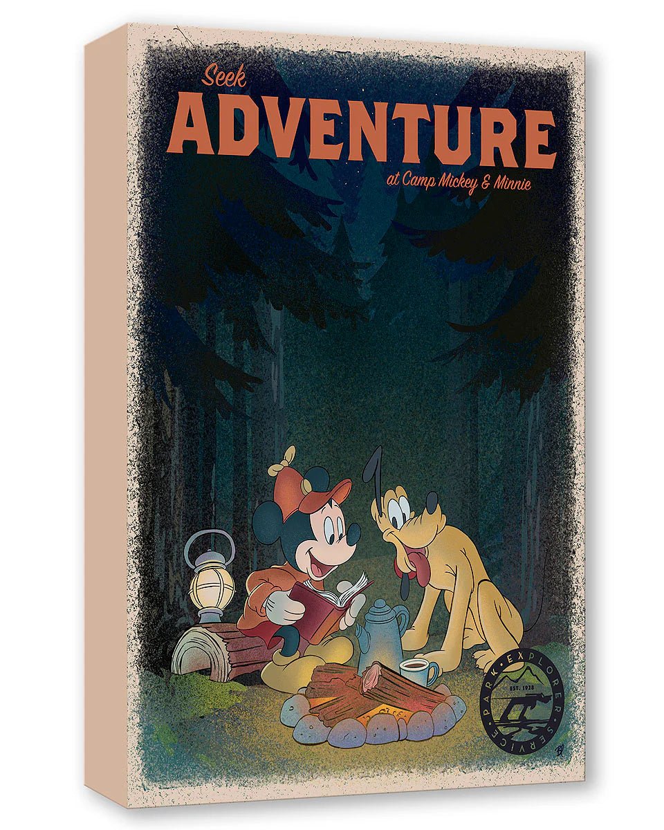 ABOUT THE IMAGE: Inspired by vintage travel posters, this artwork features Mickey and Pluto enjoying a peaceful evening by the campfire under a starlit sky, embracing the simple joys of the great outdoors. Surrounded by towering trees and the warmth of the crackling flames, the duo share a moment of friendship and adventure.