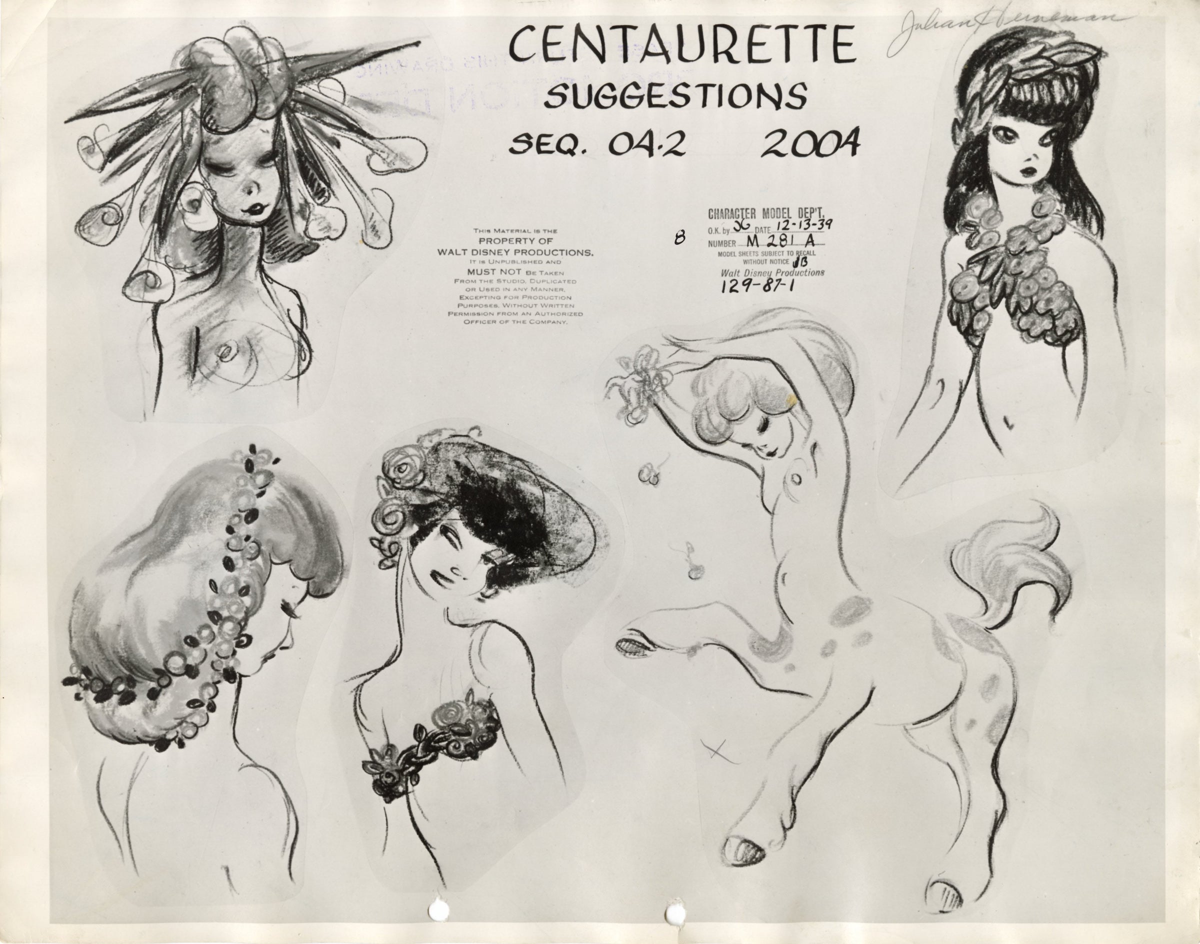 This piece is hand-signed in the top right corner by Julian Heinemann, an Art Director at Disney, and shows signs of production wear: wrinkling along edges. The embedded date on this model sheet reads December 13th, 1939.