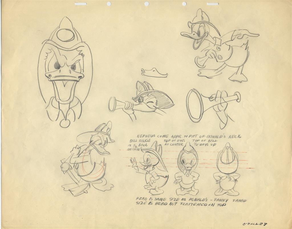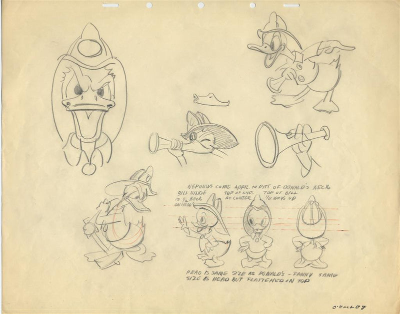 ABOUT THE IMAGE: This sheet of original character drawings of Donald Duck with nephews Huey, Dewey and Louie were created by artist Joseph O'Malley during his five years (1950-1955) in the Disney Studio story department. It is based on model sheets originally produced for the making of the Donald Duck cartoons Fire Chief (1940) and Timber (1941).
