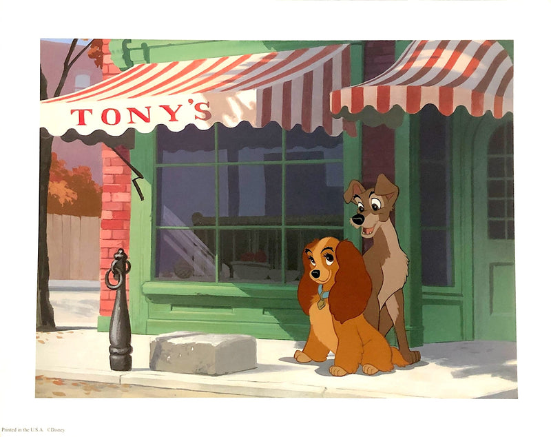 ABOUT THE PIECE: This is a wonderful portfolio of four 14" x 11" Lady and the Tramp lithographs that was exclusively sold at The Disney Store in the 1990s. The featured lithographs include "Unwanted Houseguests," "First Date," "Tony's World-Famous Spaghetti Dinner," and "Tramp Joins the Pack." Original certificate of authenticity included.