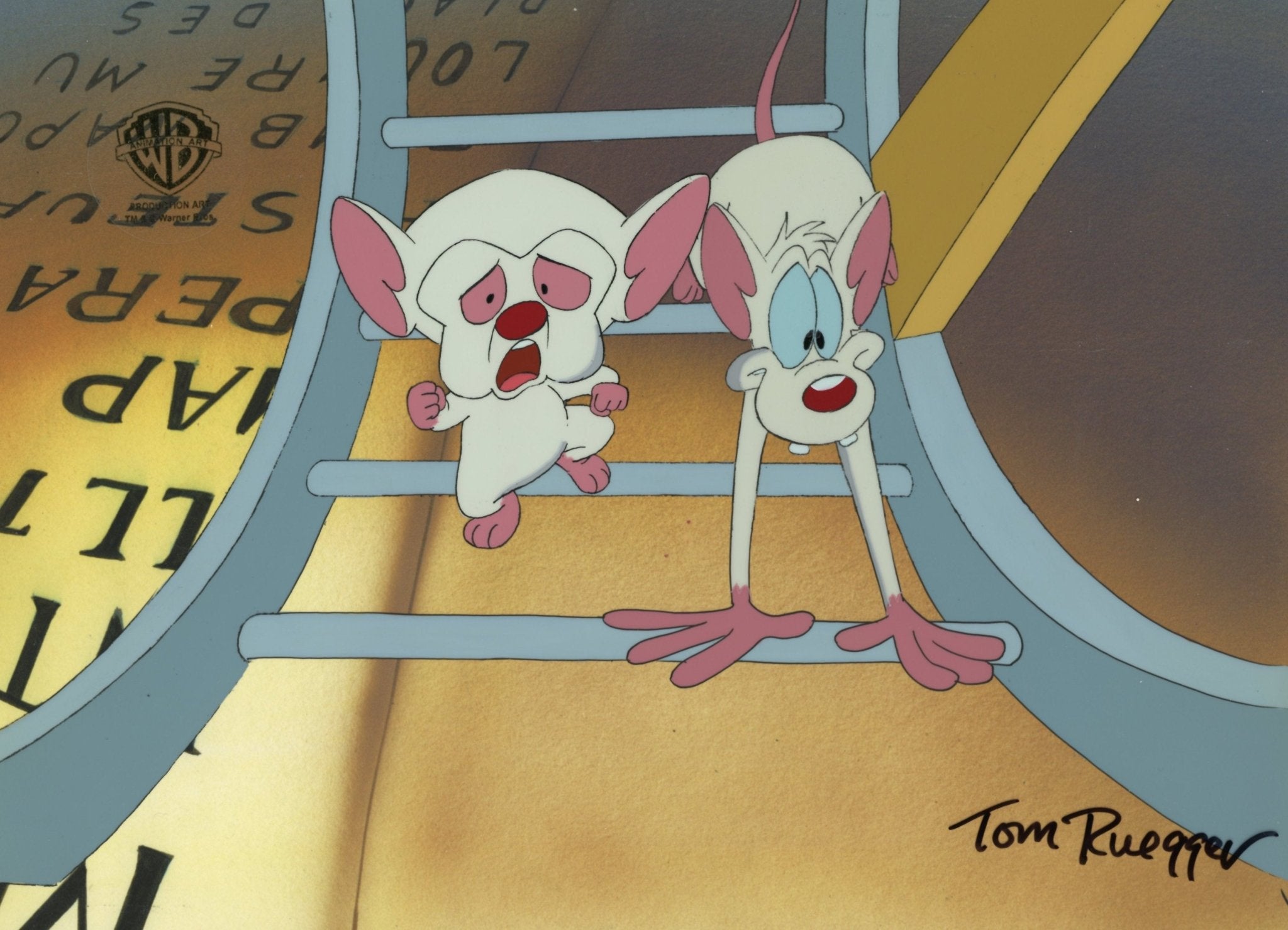 ABOUT THE IMAGE: Pinky and the Brain is a cartoon that follows a self-proclaimed genius, The Brain, and his dimwitted sidekick, Pinky, as they try to conquer the world. Pinky and the Brain was the first animated television series to be presented in Dolby Surround. It was created by Tom Ruegger and the fourth collaboration between Steven Spielberg's production company, Amblin Entertainment and Warner Bros. Animation. The characters first appeared in 1993 as a recurring skit on the show Animaniacs. Thanks to its popularity it was later spun off as a series. There were 66 episodes produced. This piece comes with a certificate of authenticity.