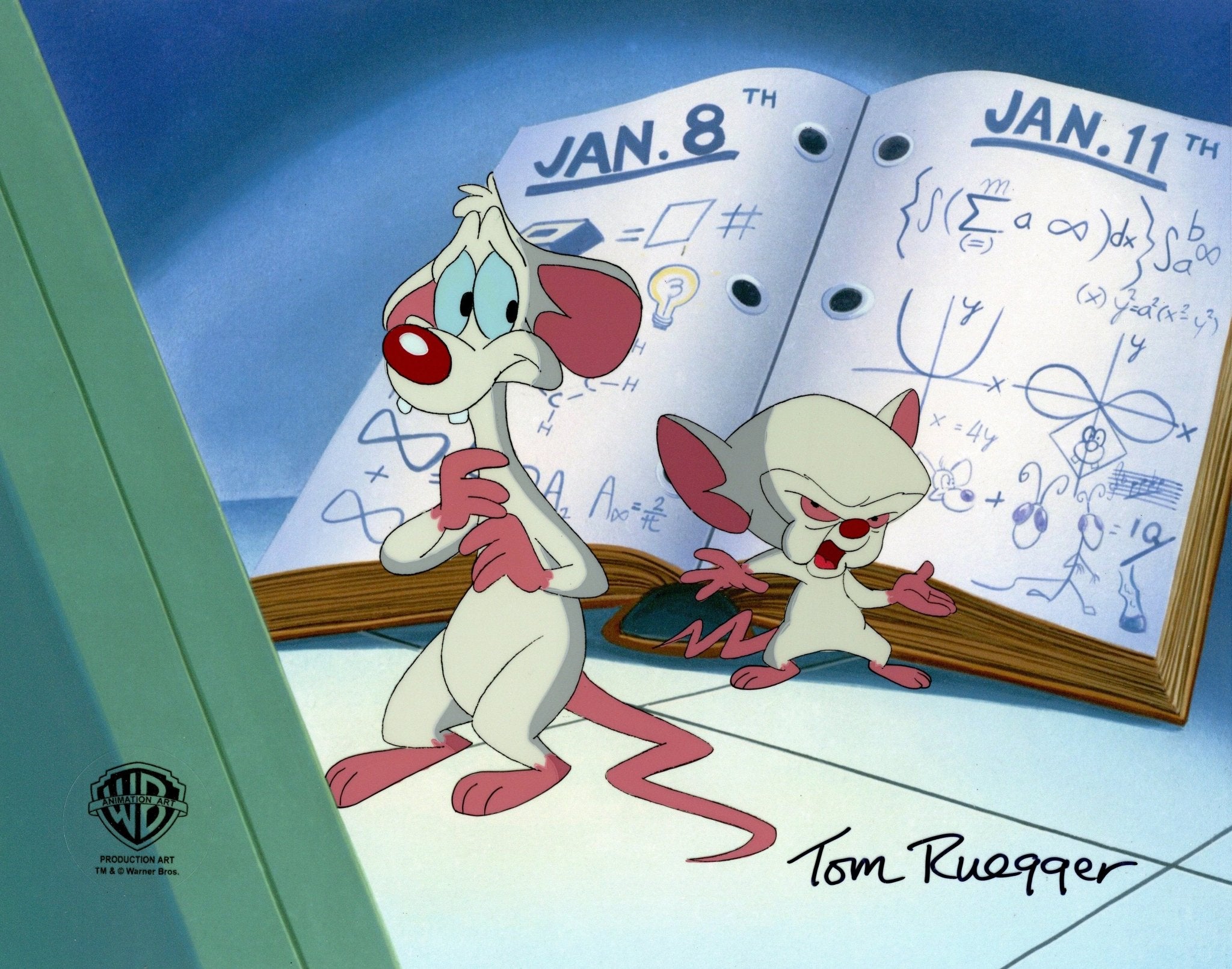 ABOUT THE IMAGE: Pinky and the Brain is a cartoon that follows a self-proclaimed genius, The Brain, and his dimwitted sidekick, Pinky, as they try to conquer the world. Pinky and the Brain was the first animated television series to be presented in Dolby Surround. It was created by Tom Ruegger and the fourth collaboration between Steven Spielberg's production company, Amblin Entertainment and Warner Bros. Animation. The characters first appeared in 1993 as a recurring skit on the show Animaniacs. Thanks to its popularity it was later spun off as a series. There were 66 episodes produced. This piece comes with a certificate of authenticity.