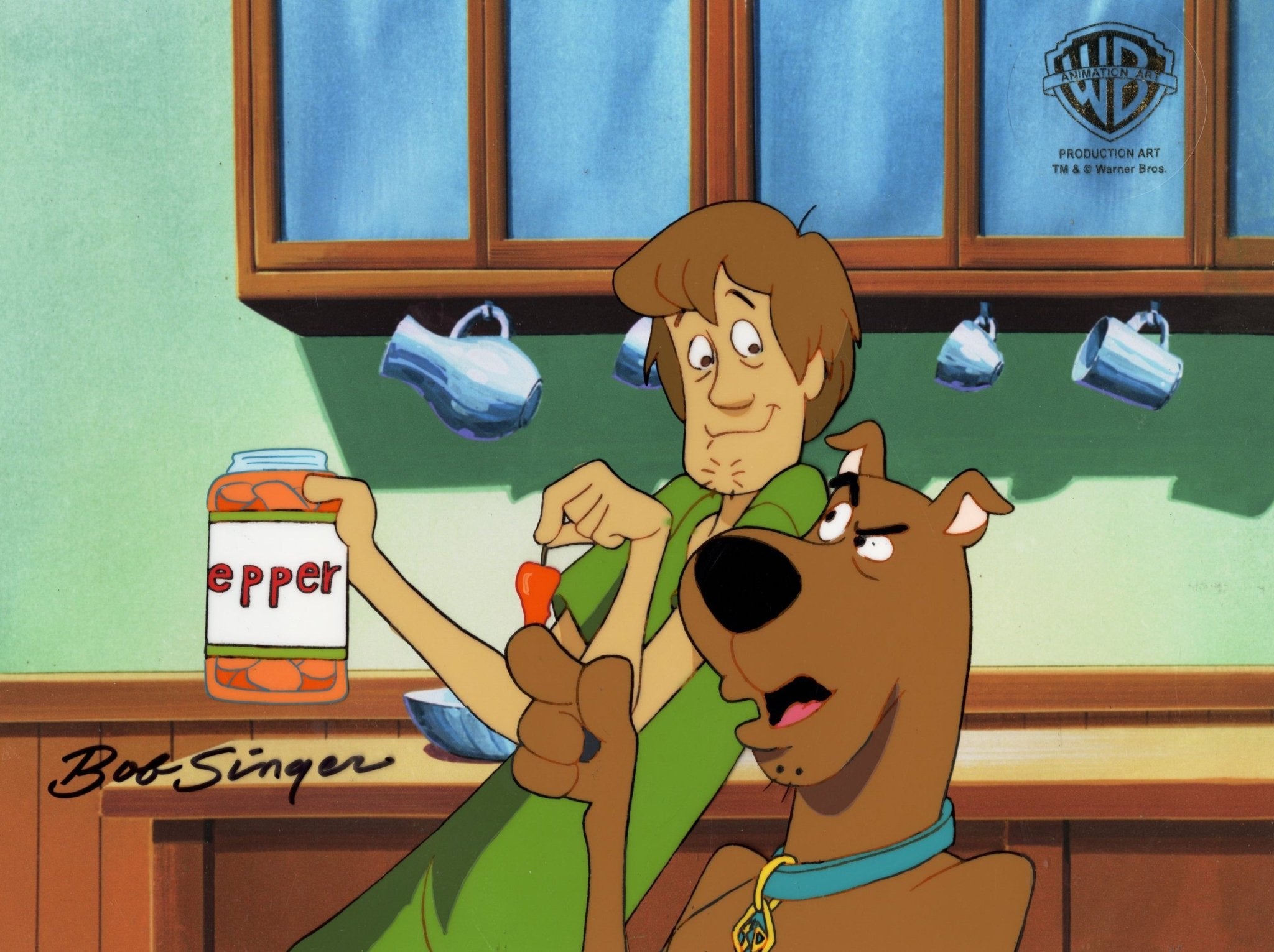 ABOUT THE IMAGE: The Hanna-Barbera cartoon, Scooby-Doo, Where Are You? was launched in 1969 and has had the longest run of a cartoon series. Over the years it’s been in 19 TV series (on CBS, ABC, the WB, Cartoon Network and Boomerang) and more than 40 animated films and two live action movies; one grossed $275 million worldwide. The show featured brainiac Velma, jock Fred, fashionista Daphne, hippie Shaggy, and the talking Great Dane Scooby-Doo, who would pile into their Mystery Machine van and hit the road searching for weird phenomena to solve. This original production cel is hand-signed by key animator Bob Singer and comes with a certificate of authenticity.
