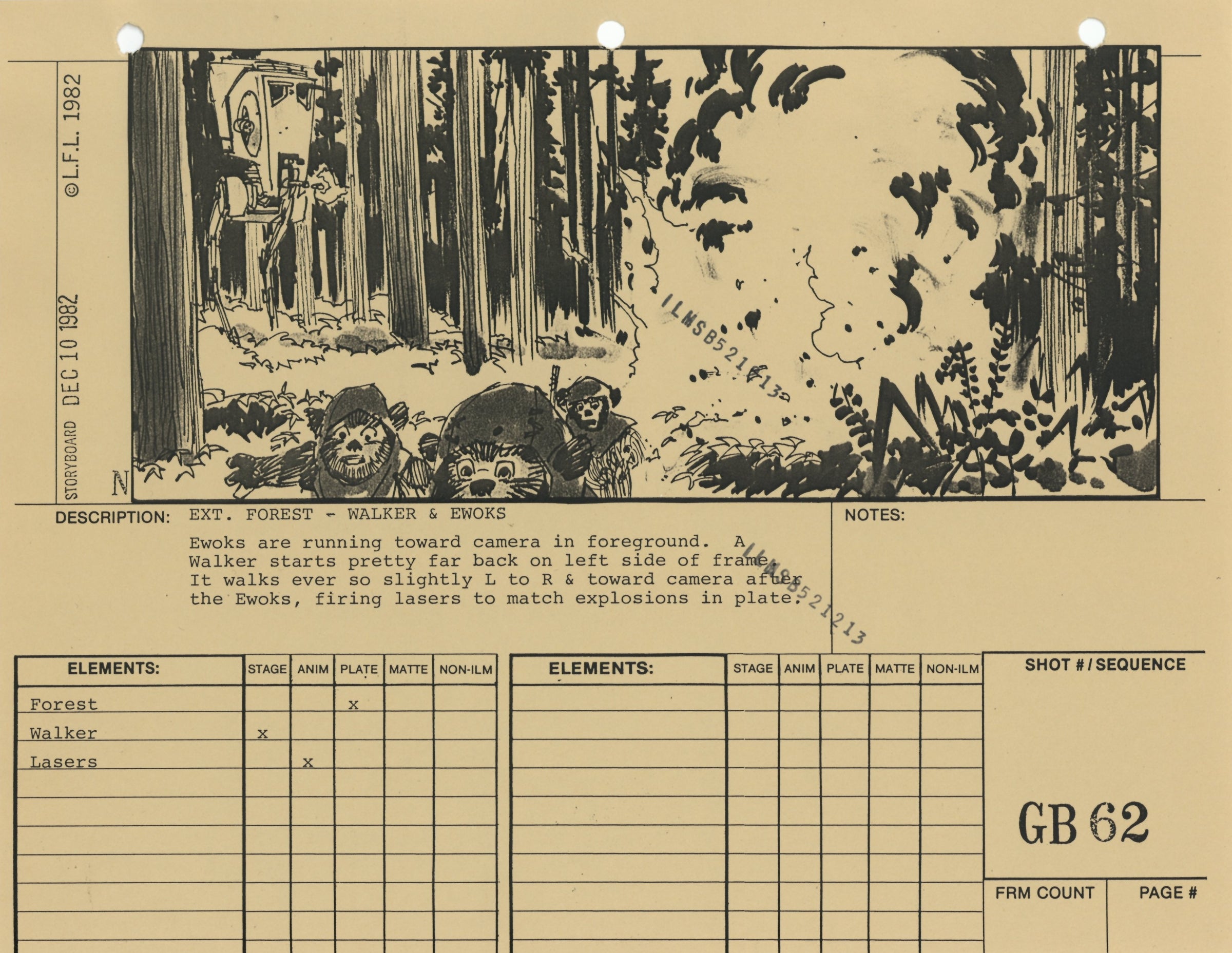 ABOUT THE ARTWORK: This photostat storyboard was used during the production of Star Wars: Episode VI - Return of the Jedi. Please note the two black "ILMSB521213" stamps as well as the 3-ring binder peg holes along the upper margin of this piece. The artist, Nilo Rodis-Jamero, is denoted by the "N" near the lower left corner of the image. Rodis-Jamero was the assistant art director of visual effects for Star Wars: Episode V - The Empire Strikes Back and costume designer for Star Wars: Episode VI - Return of the Jedi.