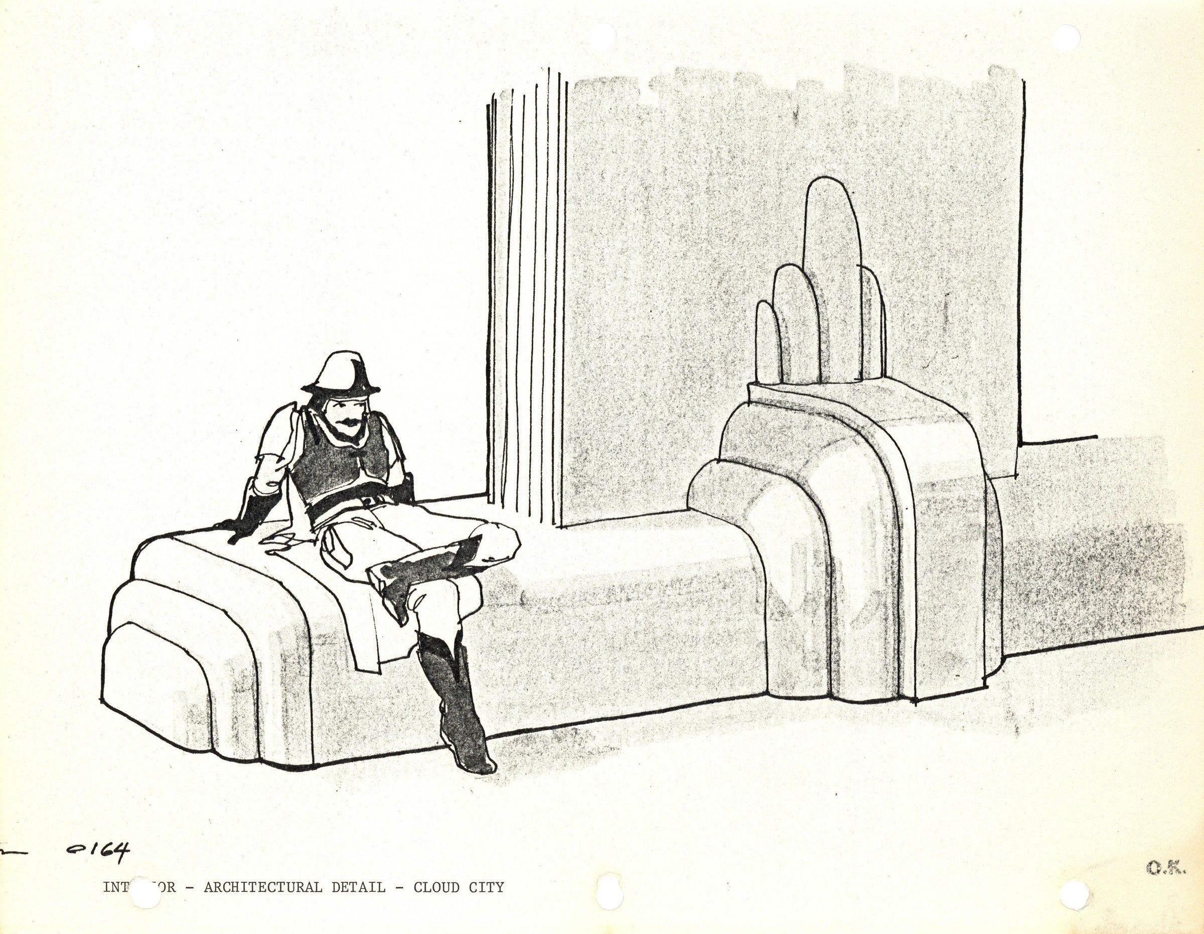 ABOUT THE IMAGE: This photostat print was used during the production of Star Wars: Episode V - The Empire Strikes Back. It depicts architectural details in Cloud City, specifically of an interior column. A Cloud City denizen or guard sits casually in the scene. Please note the embedded production code and cut off signature of the film's art director Joe Johnston in the bottom left corner. An "ok" stamp is also visible in the bottom right corner. There are two sets of 3-ring binder peg holes on the upper and lower margins of the piece.