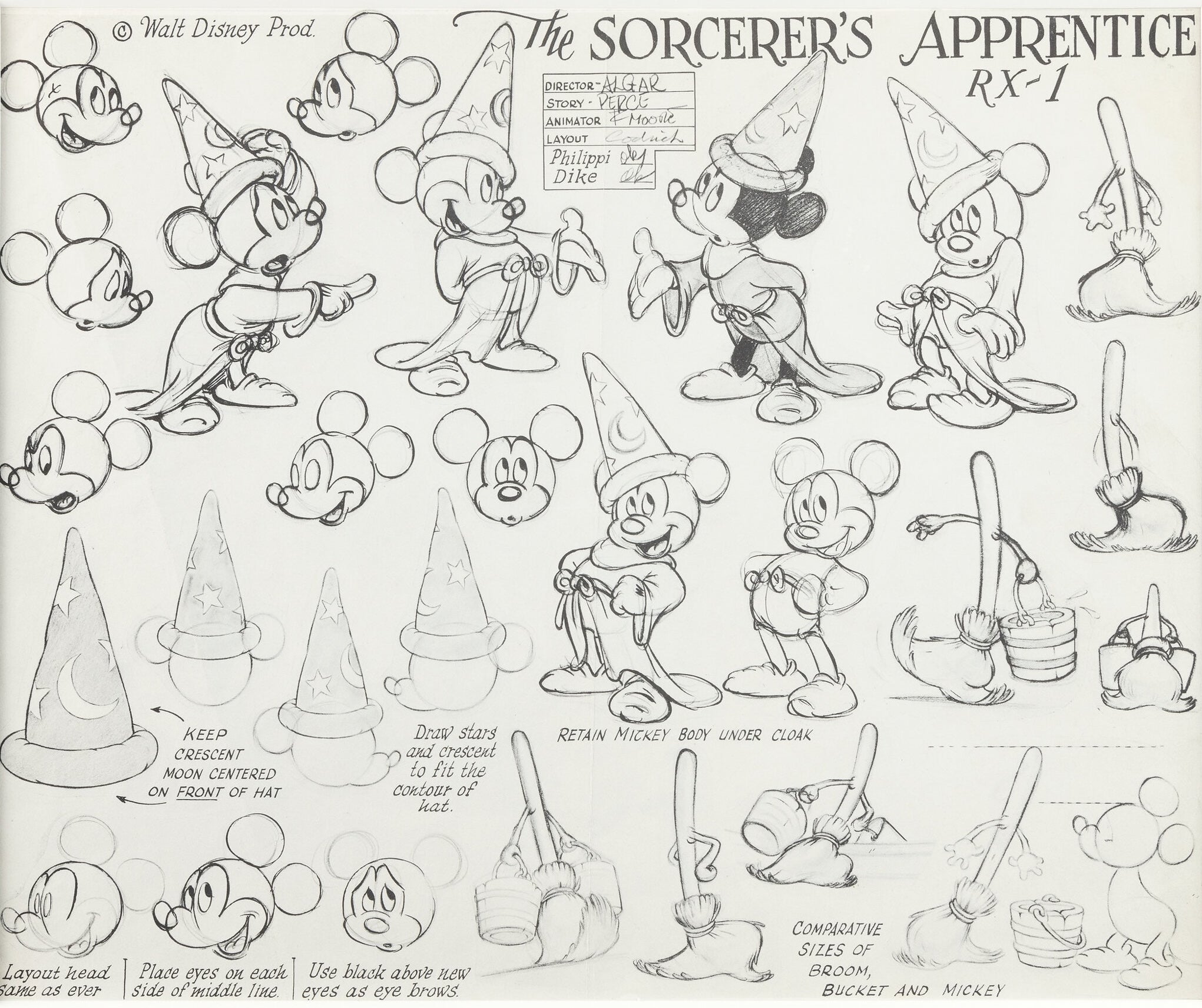ABOUT THE IMAGE: The model sheet, printed on photographic paper, features Mickey in his greatest role and gives us a rare look at the Disney animation process with amazing poses, larger-than-life expressions, and tips for how to keep this beloved character consistent. Several of the magical brooms Mickey created to help him are also included on the sheet for size comparisons, an important aspect of keeping the character on model. The piece is a wonderful way to keep the Disney magic alive!