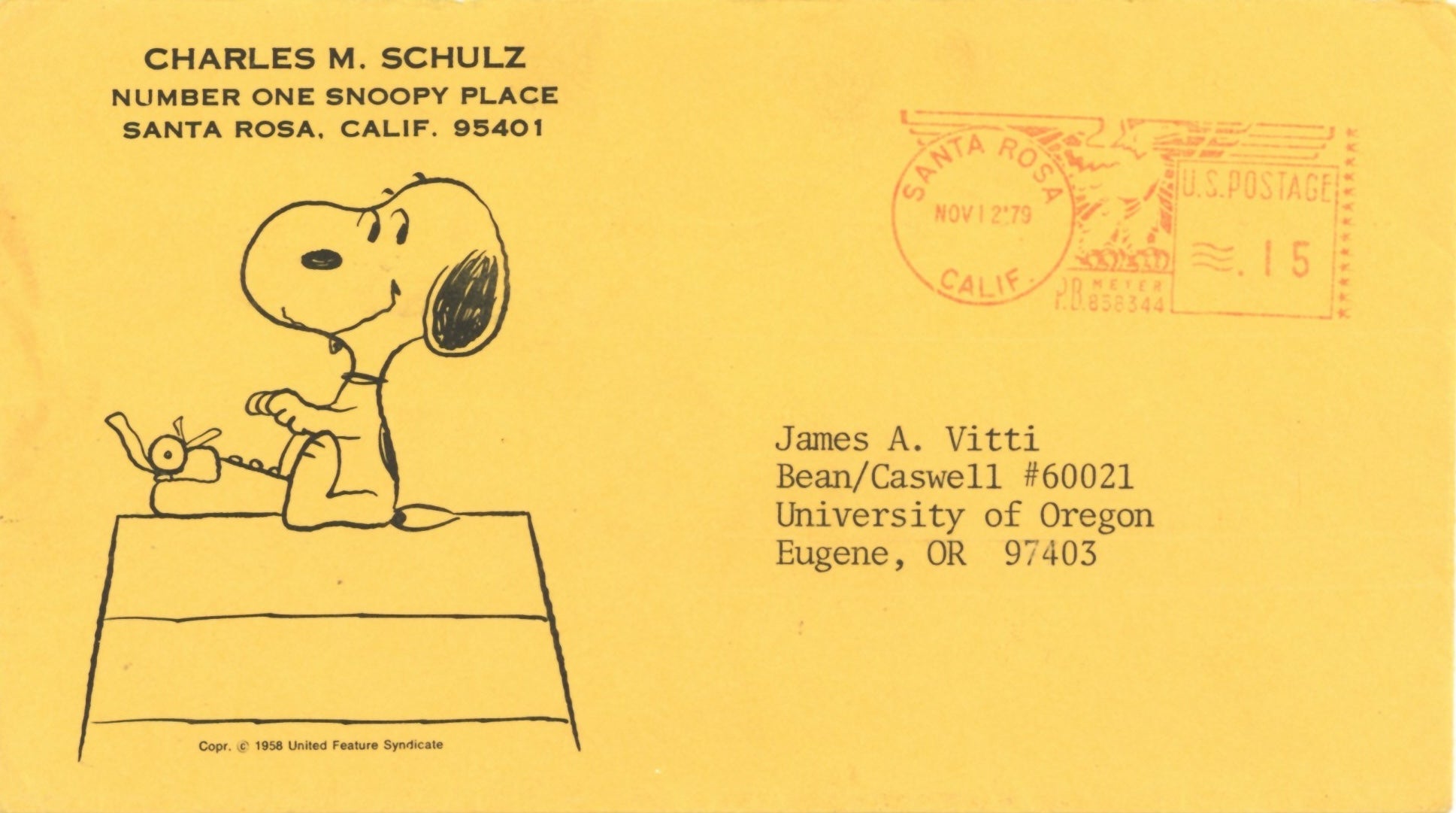 ABOUT THE IMAGE: This signed letter, dated November 12th, 1979, was sent by Charles M. Schulz. In it, he responds to the inquiry of a man named James Vitti who was interested in purchasing a specific Peanuts comic strip. This piece comes with a certificate of authenticity.